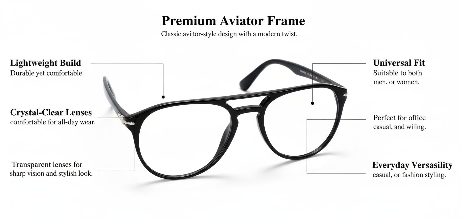 Elevate your everyday look with these premium black full-rim eyeglasses, crafted for both style and comfort. The sleek aviator-inspired design with a keyhole bridge adds a modern touch, while the durable acetate frame ensures long-lasting wear. Perfect for prescription lenses or as a fashion accessory, these glasses offer a versatile appeal that suits any outfit or occasion.