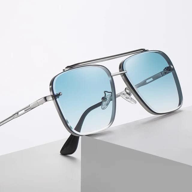 These sunglasses feature a sleek double-bridge design with a metallic silver frame. The gradient blue-tinted lenses add a modern touch, while the slim arms with black plastic end tips ensure comfort. The square shape enhances their bold and stylish appeal, making them a great choice for a fashionable look. Let me know if you need any modifications for your product listing!